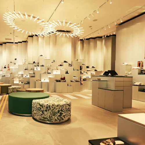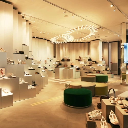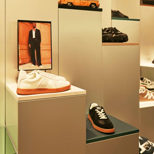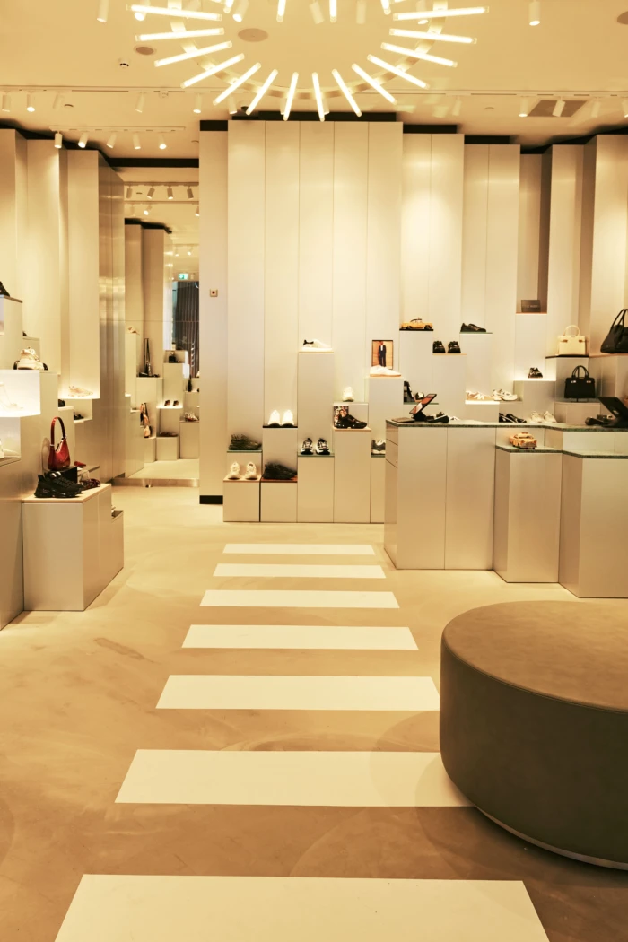 That translation is carried through in every detail. “It’s all about New York, so we literally placed yellow cabs inside the store,” says project manager Harm Kempers. “But we didn’t stop there: we added a zebra crossing that doubles as a catwalk leading to a mirror, topped with lights inspired by the Statue of Liberty’s crown. Green benches for trying on shoes reference Central Park.”