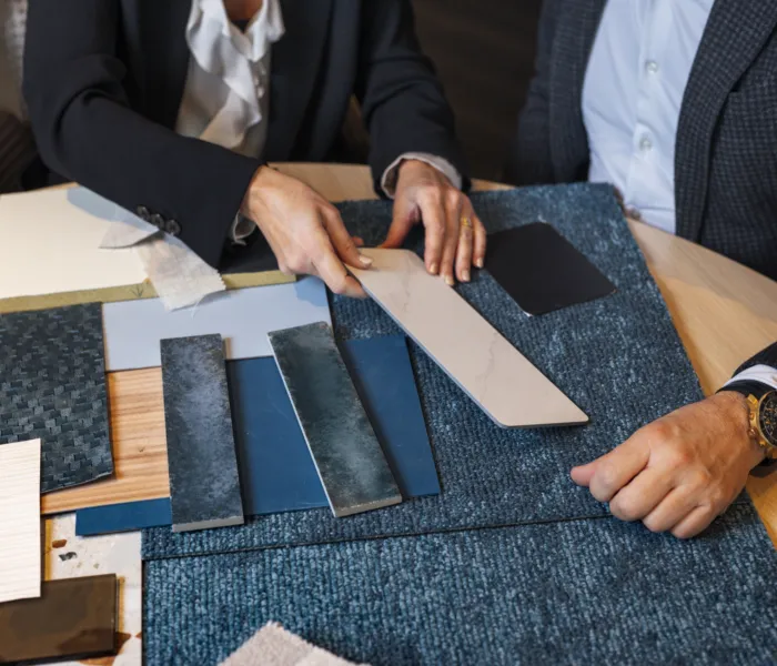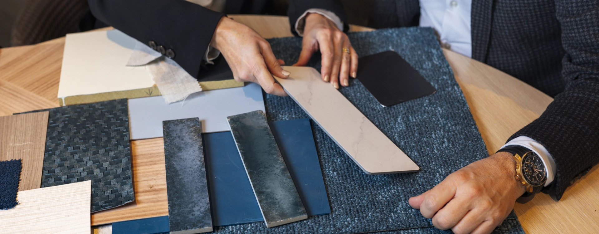 Lione and Robert sit around the table with Project Developer Ingrid Reacq from Bulsink, surrounded by samples—carpet, wallpaper, tiles, glass, curtain fabrics, and paint swatches. Ingrid has also brought two chairs. It’s decision time, as work is set to start in a month.