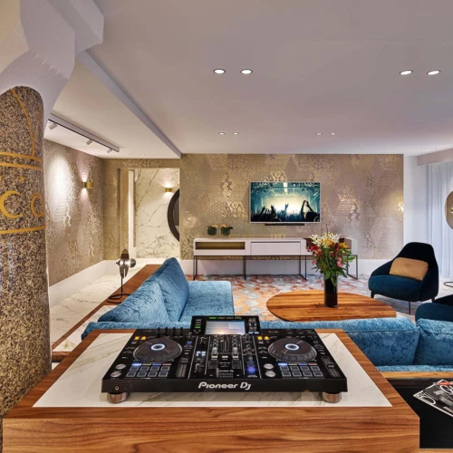 Een mooie ruimte met een gewelfd plafond dat, net als de wanden, volledig is bedekt met behang. Bijzonder is ook de vloerbedekking; een print-tapijt dat een Marrakesh Express-gevoel oproept.