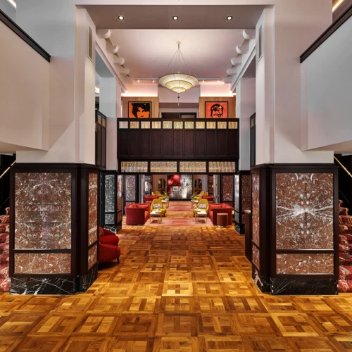 Een van de opvallendste elementen bij binnenkomst is de monumentale marmeren trap met rode loper. Tijdens een eerdere verbouwing was deze trap tot halverwege ingekort.
