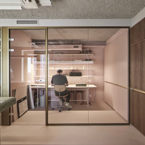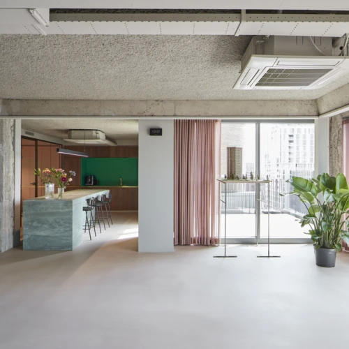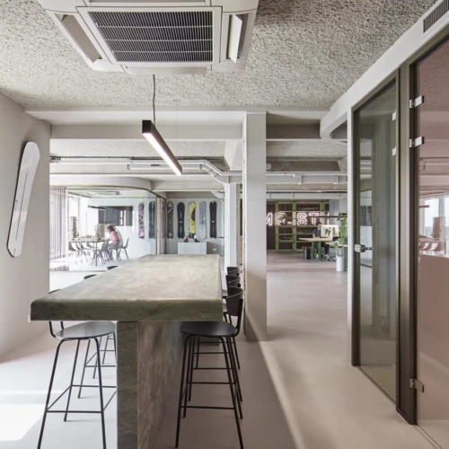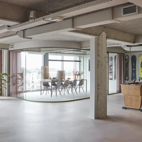 Om het industriële karakter te versterken en tegelijkertijd een rustige en samenhangende sfeer te creëren, zijn de plafonds tussen de betonnen balken voorzien van gerecycled akoestisch spuitwerk. Dit zorgt niet alleen voor een uitstekende geluidsisoloatie, maar houdt ook een blik op duurzame bouwtechnische oplossingen.