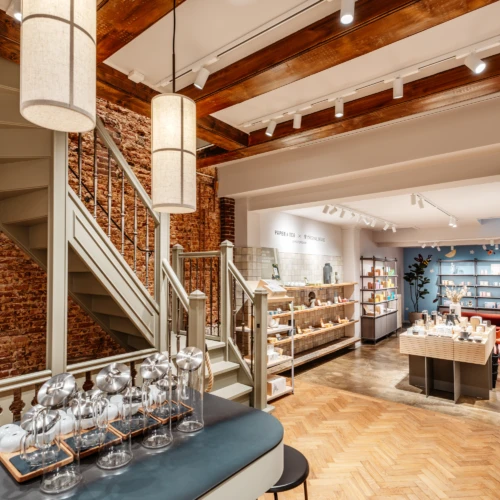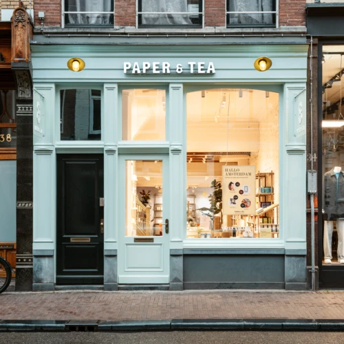 De nieuwe locatie in Amsterdam is de derde winkel van PAPER & TEA in Nederland. In het twee verdiepingen tellende pand staat niet het assortiment, maar de beleving centraal. De belangrijkste eye-catcher is een grote theebar in het midden van het souterrain. Ook de eerste verdieping heeft een zitgedeelte, waar bezoekers kunnen neerstrijken met een kop thee of matcha latte.