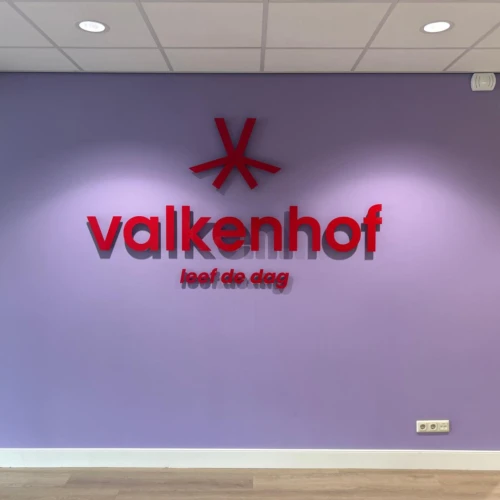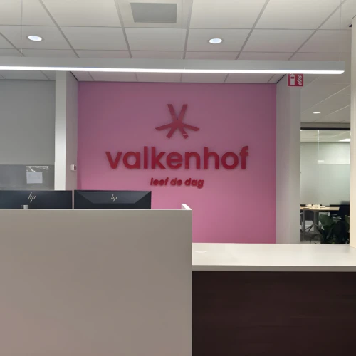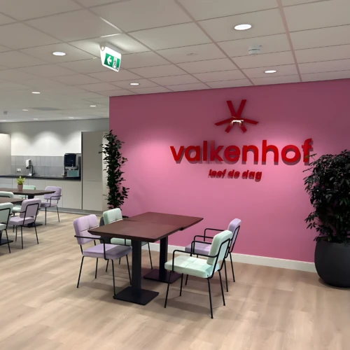 Valkenhof, een zorgorganisatie voor ouderenzorg, heeft een nieuw kantoor in Valkenswaard. Het project had als doel om de nieuwe kleurrijke huisstijl van Valkenhof te integreren met een vertrouwde esthetiek om een gastvrije omgeving voor hun klanten te creëren.